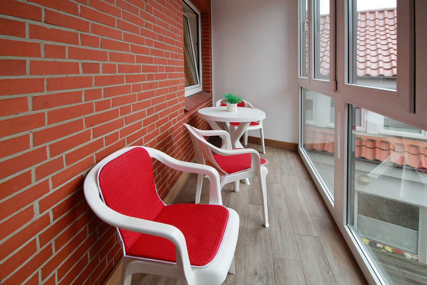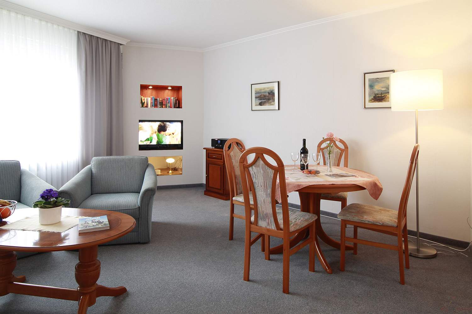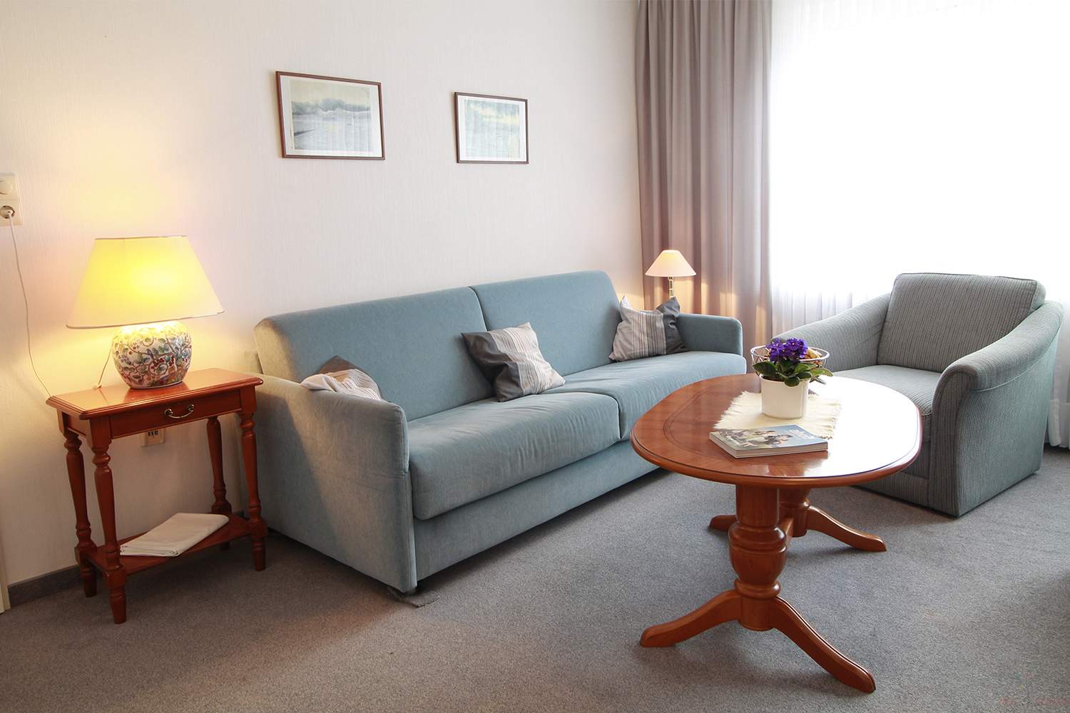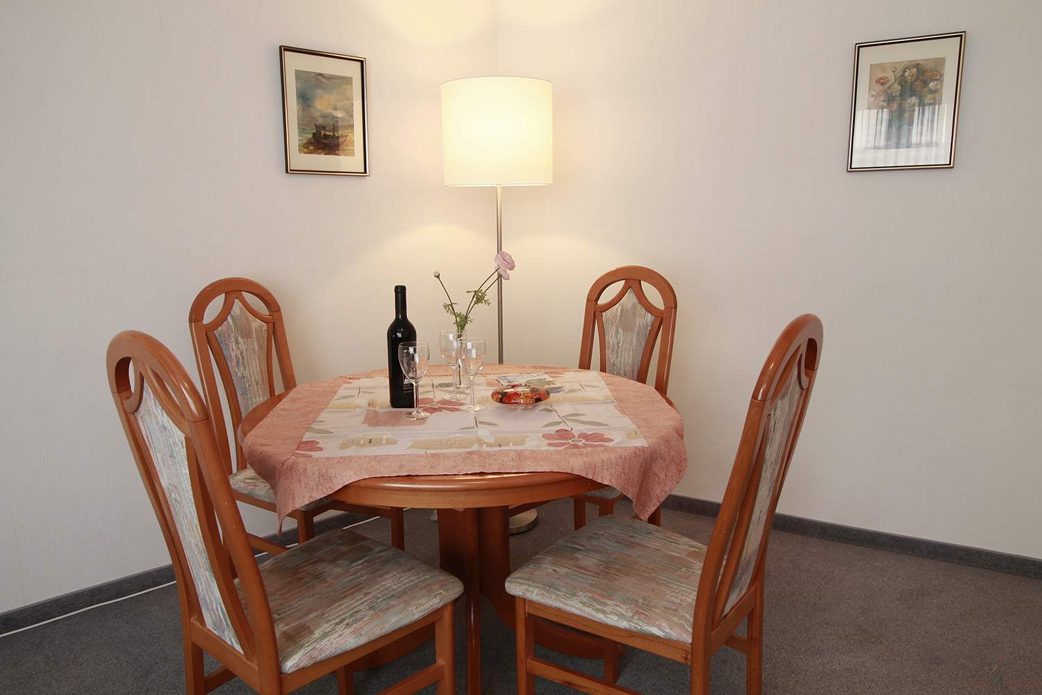 - Wohnzimmer: 2-Personen-Verwandlungssofa, 2 Sessel, Esstisch, HD-Kabel-TV